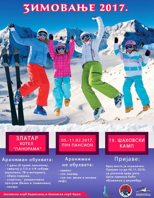19. Шаховски (спортски) камп одржаће се на Златару – Хотел „Панорама“ од 05.-11.02.2017. Школа скијања, креативне радионице, дискотека и вечерња анимација… Такмичења осим шаха: скијање (слалом, велеслалом и весели слалом), фудбал на снегу, пикадо, надвлачење конопцем, стони тенис, пливање, игре изненађења…